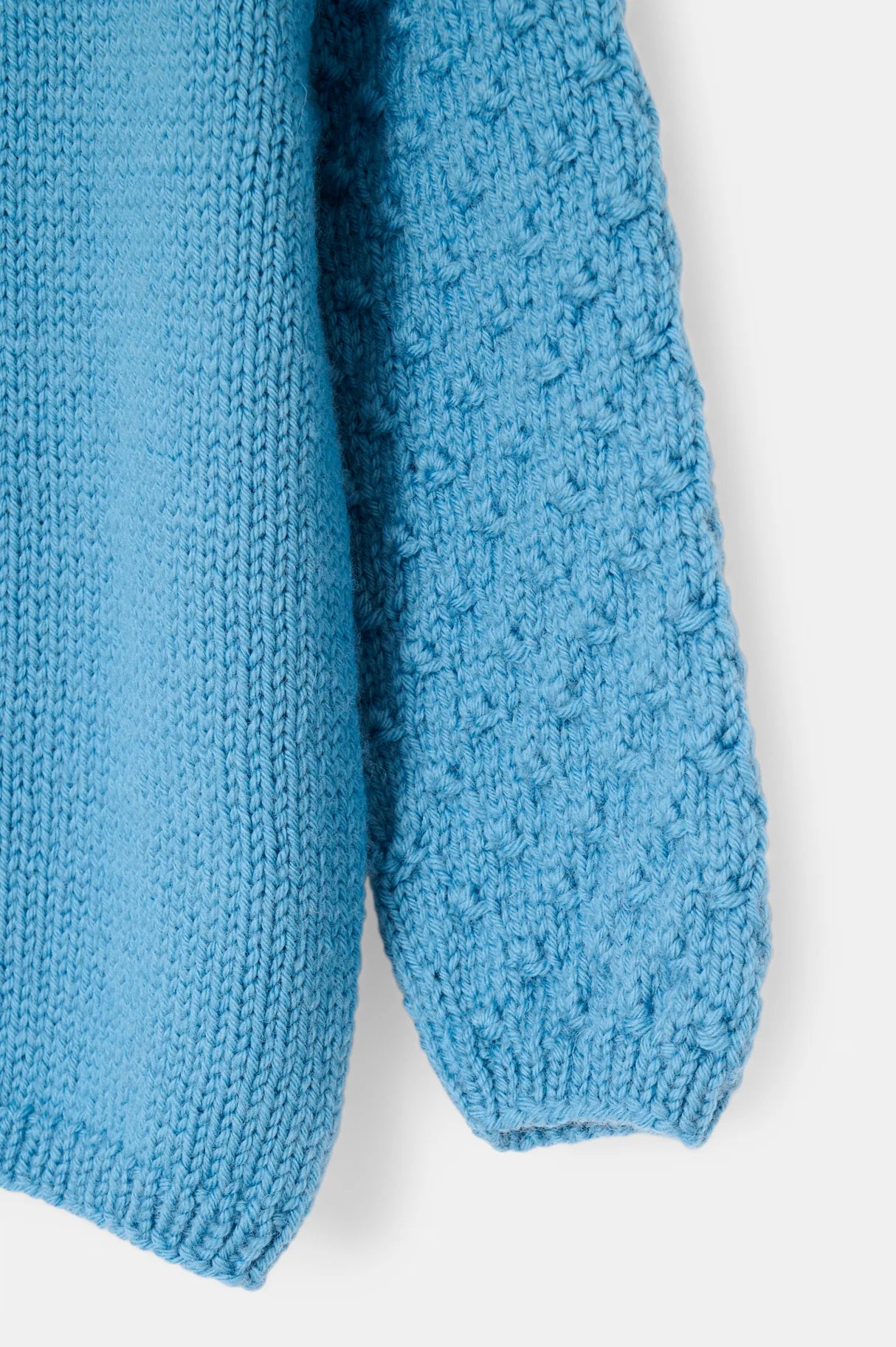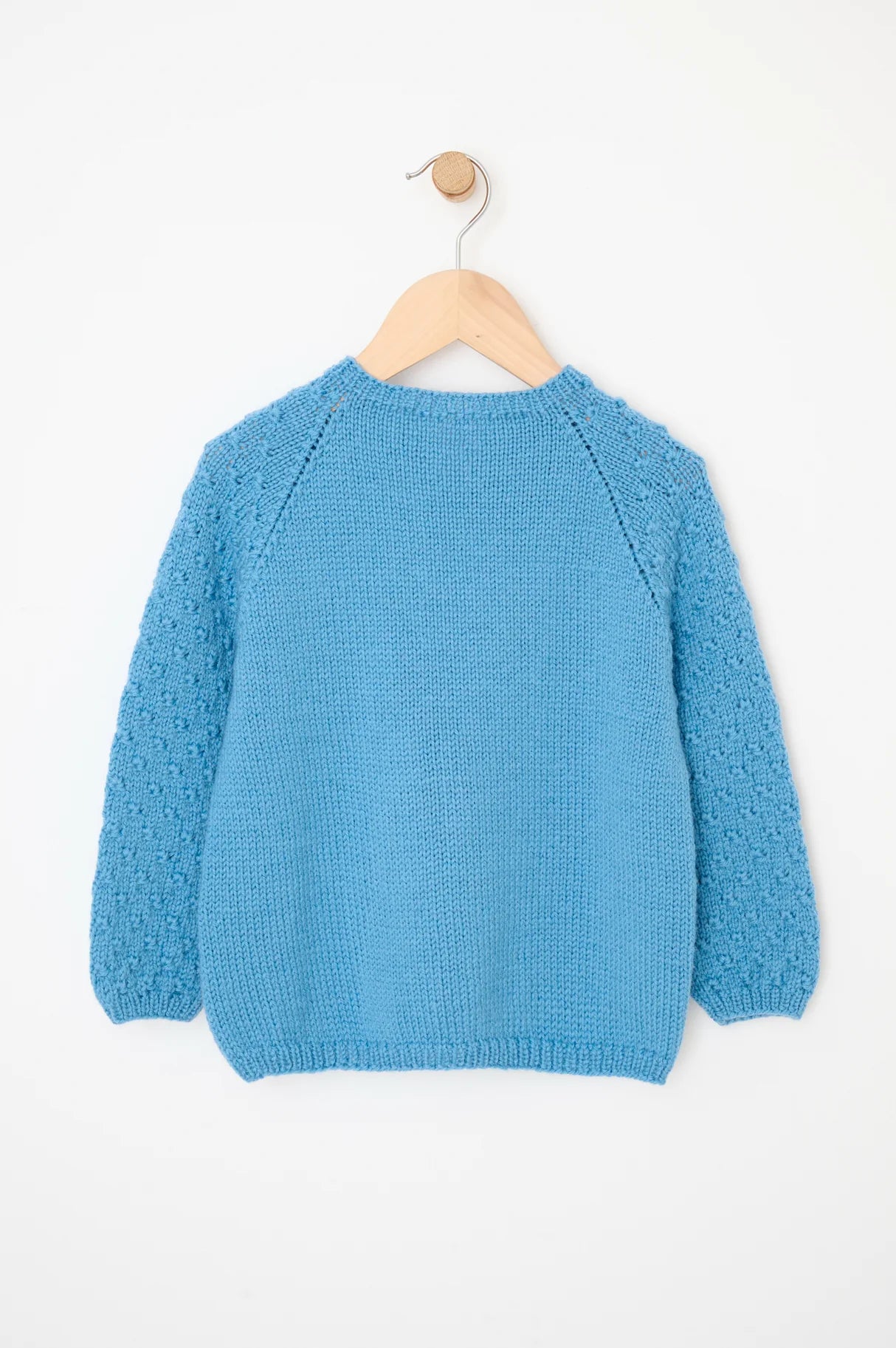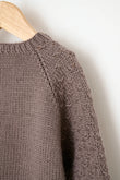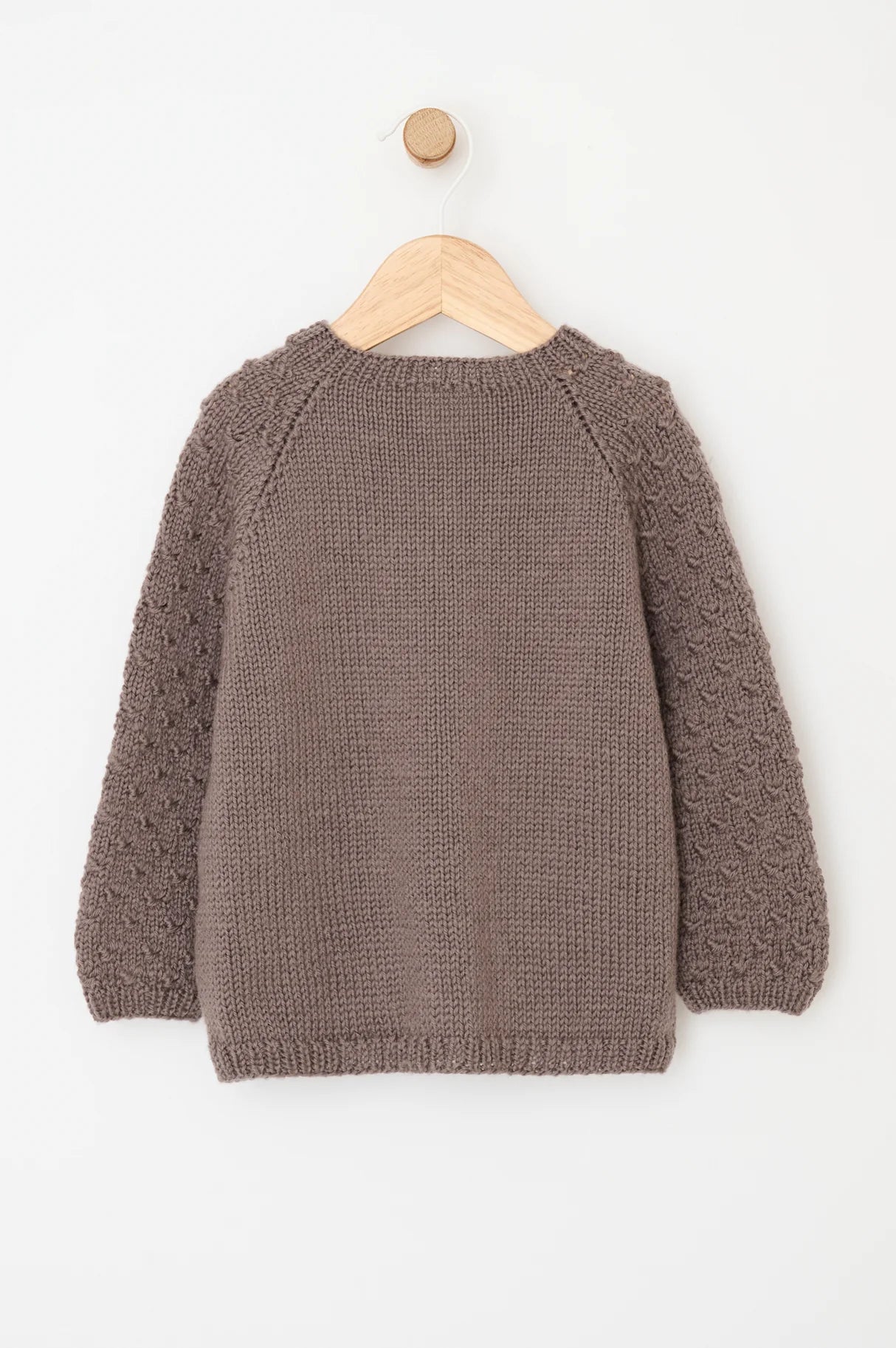 Lækker sweater med strukturmønster på ærmerne. Åkande sweateren kan strikkes til nyfødte og op til børn i 4-års alderen. Trøjen strikkes nedefra og op med glatstrik på kroppen og knudemønster på ærmerne. Der er en slids i nakken, som lukkes med en lille knap.