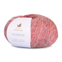 Premium Georgina er et eksklusivt, blødt garn med et smukt farvespil, der er spundet på rene fibre af høj kvalitet i Italien. Georgina har nogle lækre, dragende farver og et flot meleret udtryk, og multifarvede hørfibre giver ekstra farvespil og effekt til det smukke garn.