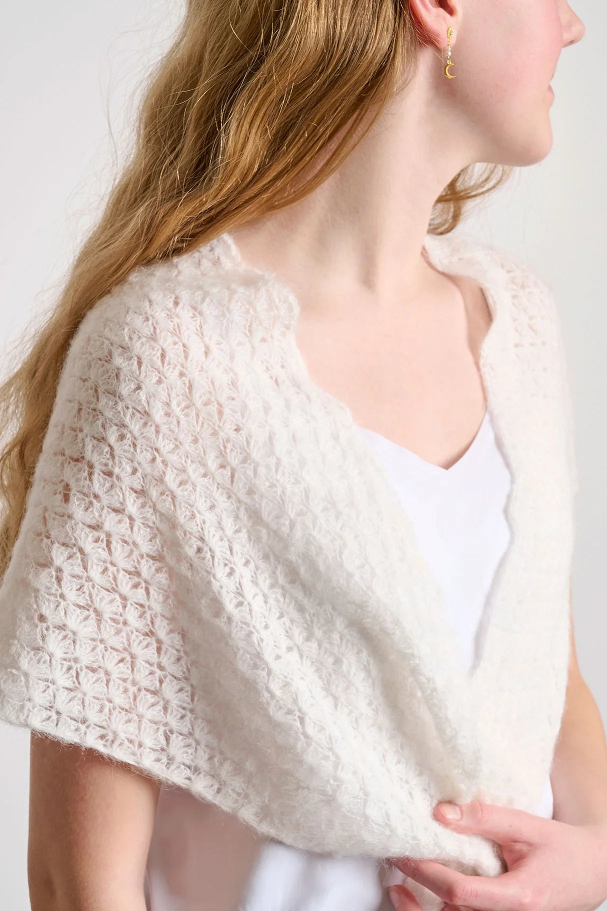 Flot, trekantet sjal, som er hæklet med et flot hulmønster. Det fine og eksklusive sjal har et smukt, skinnende udtryk, da det hækles i den florlette alpakablanding Mayflower Elba.