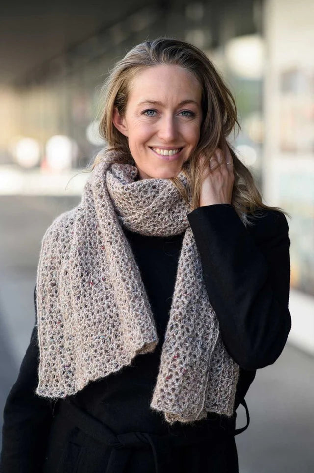 Det hæklede tørklæde er både blødt, varmt og voluminøst og vil derfor få dig godt igennem årets koldeste måneder. Tørklædet kan også sagtens bruges som et let og fint sjal til en kjole. Tørklædet hækles med stangmasker og luftmasker i et klassisk V-mønster og er derfor et meget nemt projekt at gå i gang med, selv hvis du er nybegynder. Med Mayflower Casablanca Lux får du et virkelig blødt, luftigt og lunt tørklæde. Garnet er nemlig spundet på bl.a. alpaka og uld, og indholdet af bomuld sørger for, at tørklædet ikke bliver alt for varmt. Garnet giver desuden tørklædet et forrygende farvespil, da kvaliteten indeholder både tweednister og en tynd glimmertråd. Tweednisterne bidrager til blødheden, og glimmertråden giver et eksklusivt og luksuriøst look til tørklædet, hvilket gør det flot til både hverdag og fest. Størrelse: Længde x bredde, cm: 175 x 45