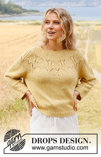 Strikket bluse i DROPS Belle eller DROPS Merino Extra Fine. Arbejdet strikkes med rundt bærestykke, hulmønster og ¾ lange ærmer. Størrelse S - XXXL.